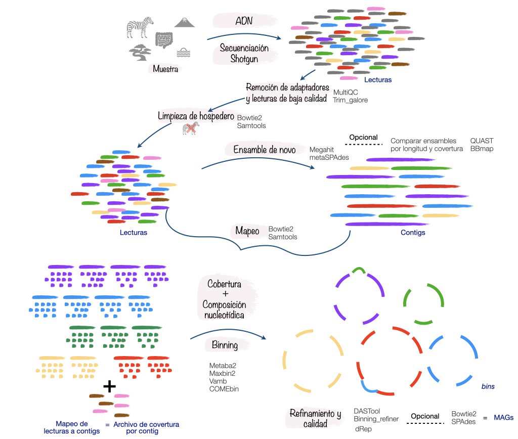 En este apartado nos enfocaremos en la segunda aproximación. Los MAGs se reconstruyen a partir de un ensamble metagenómico,