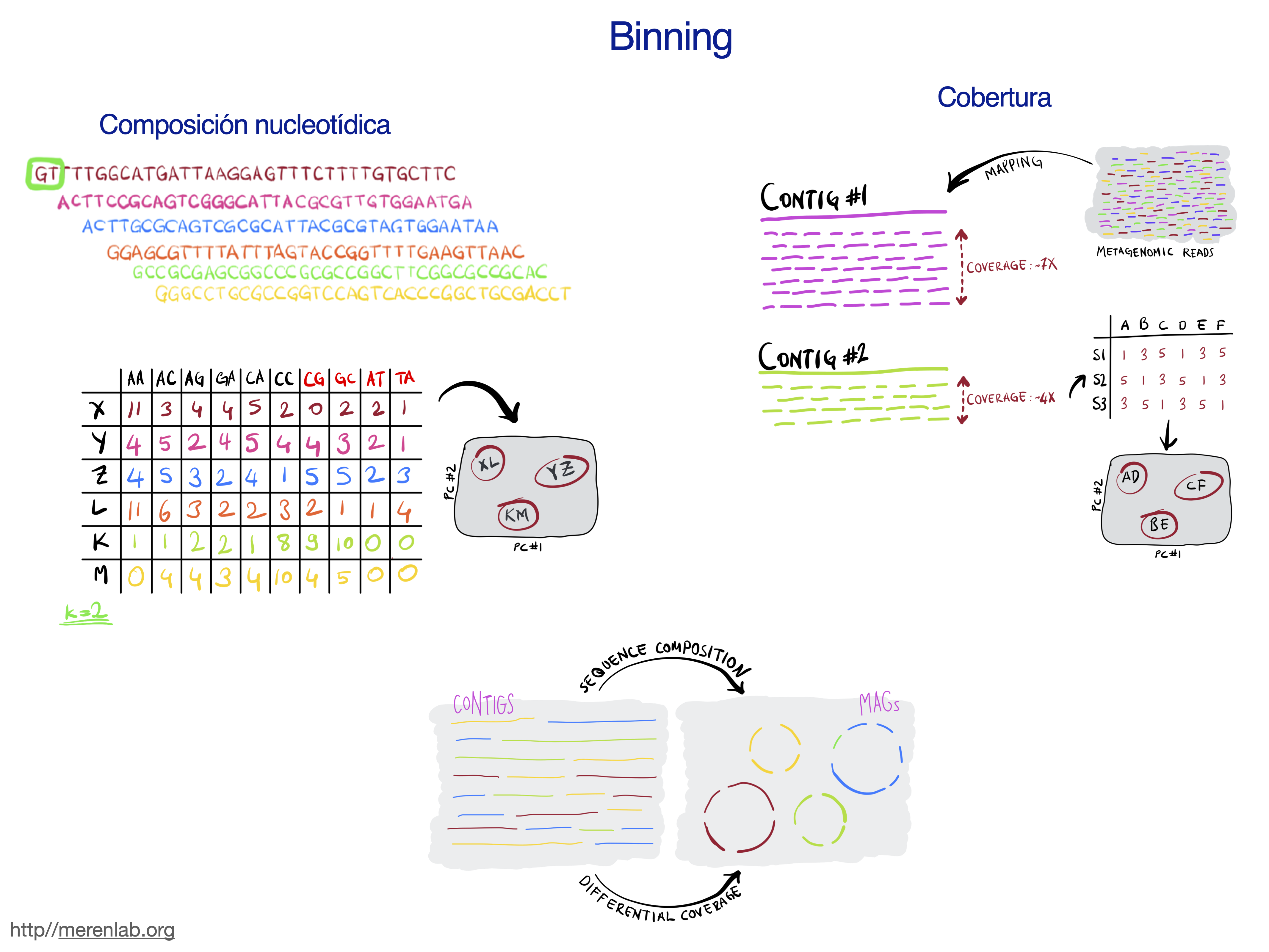 los contigs de dicho ensamble se agrupan mediante la información de cobertura y frecuencia de tetranucleótidos.