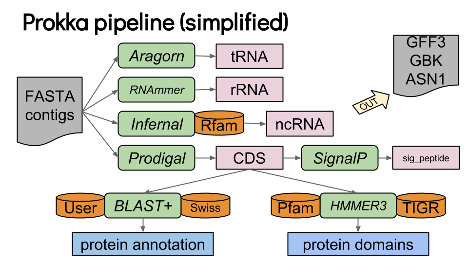 Prokka es una herramienta útil, usa diferentes programas para predecir genes, secuencias codificantes, tRNAs, rRNAs. Hace la traducción de CDS a aminoácidos y asigna funciones usando varias bases de datos.